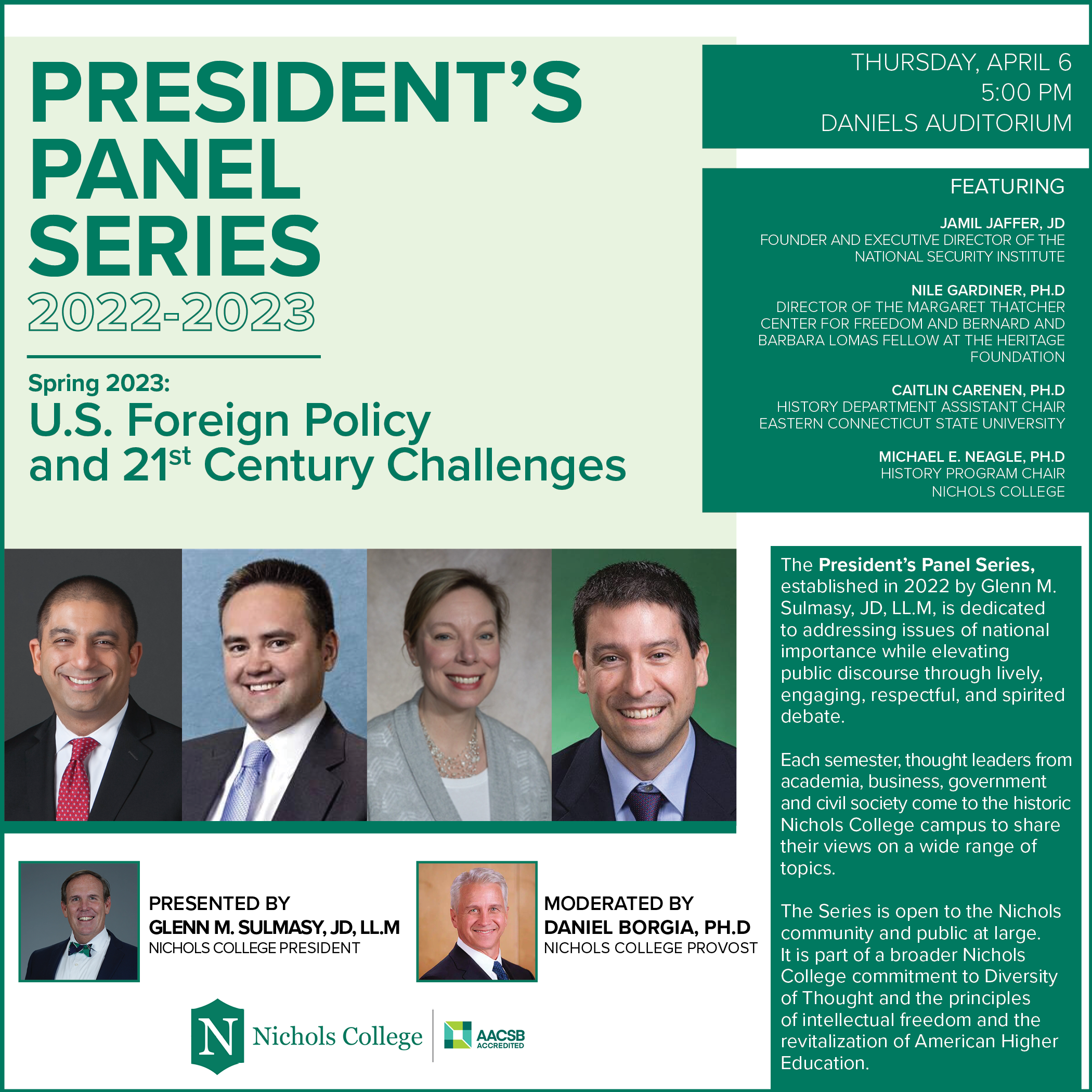 President Sulmasy established the President Panel Series in 2022 to uphold the Nichols College dedication to diversity of thought, the principles of intellectual freedom and the revitalization of American Higher Education.